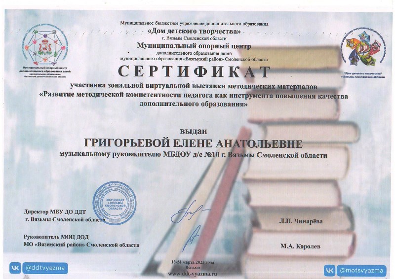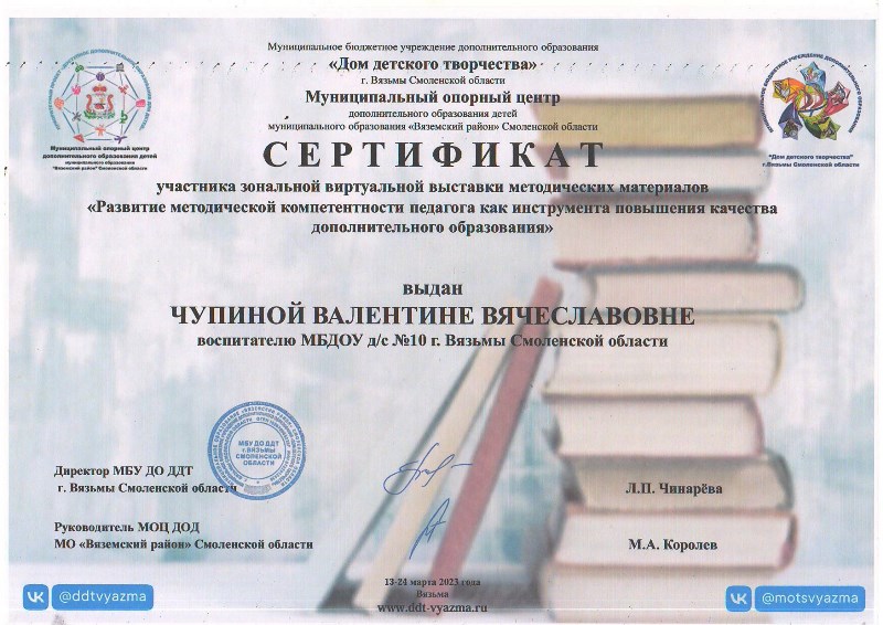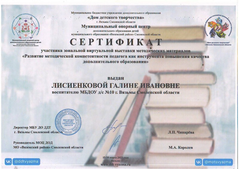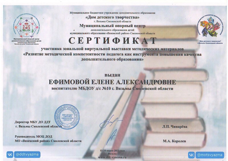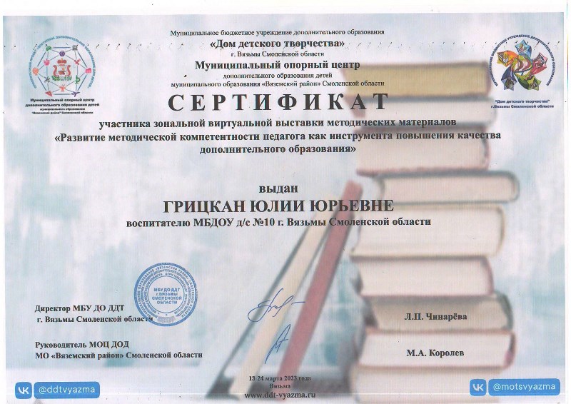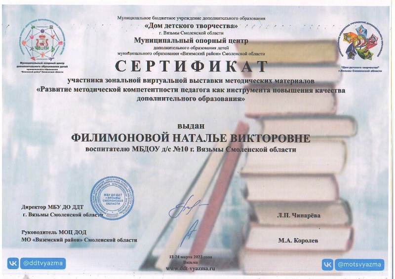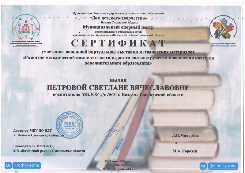 Педагоги детского сада приняли активное участие в зональной виртуальной выставке методических материалов «Развитие методической компетентности педагога как инструмента повышения качества дополнительного образования». Десять образовательных программ социально-гуманитарной, художественно-эстетической, естественно-научной направленности представлены для обмена опытом: театральная студия «Золотой ключик», «Экологический театр», «Сказки для воспитания души», «Истоки», «Волшебная кисточка», «Мы – маленькие волшебники», песочная анимация «Хочу все знать», логоритмика «Подвижный говоруша», «С чего начинается Родина». Участникам вручены сертификаты.