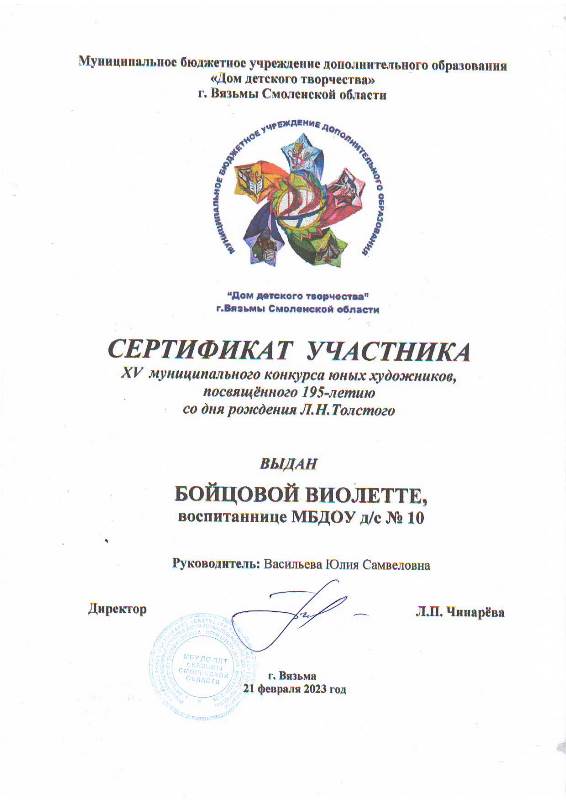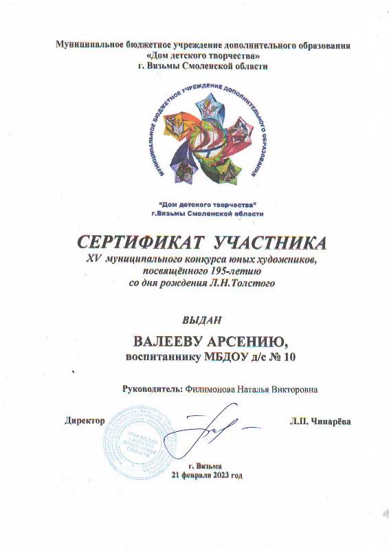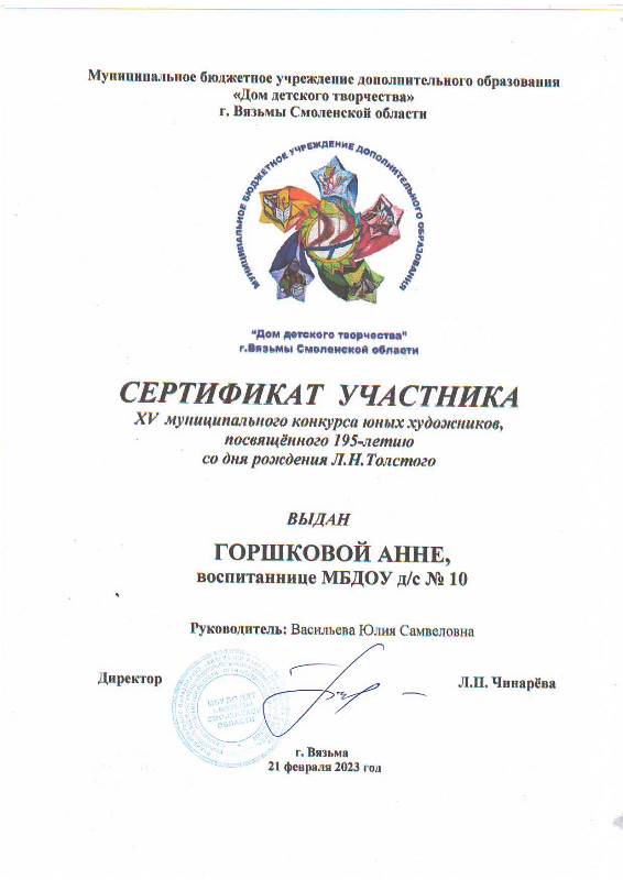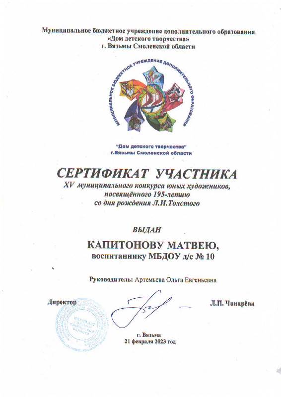 Сертификаты участников получили дети – участники муниципального конкурса юных художников, посвященного 195-летию Л.Н.Толстого в номинации «Иллюстрации к рассказам для детей Л.Н.Толстого»: Горшкова Анна, Мартиросян Ангелина, Бойцова Виолетта, Капитонов Матвей, Валеев Арсений.