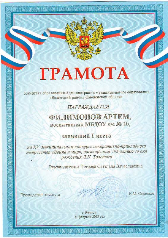 Грамотой Комитета образования Администрации МО «Вяземский район» Смоленской области награжден Филимонов Артем, занявший 1 место в XV муниципальном конкурсе декоративно-прикладного творчества «Война и мир», посвященном 195-летию Л.Н.Толстого в номинации «Куклы-костюмы» - «Филиппок».
