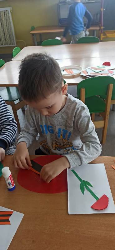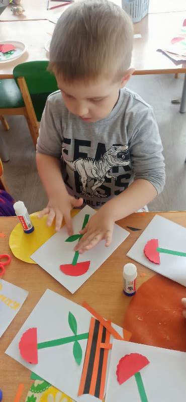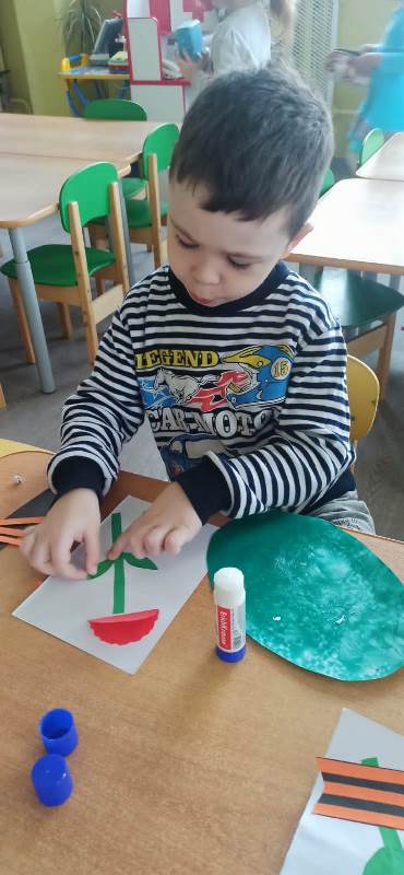 В средней группе №5 для формирования представлений детей о событиях ВОВ проведены беседы и занятия, посвященные Дню Победы. Это способствует воспитанию патриотических чувств у детей дошкольного возраста. Дети внимательно слушали рассказы воспитателей о событиях тех тяжёлых лет, рассматривали картинки и оформили аппликацию с георгиевской лентой.