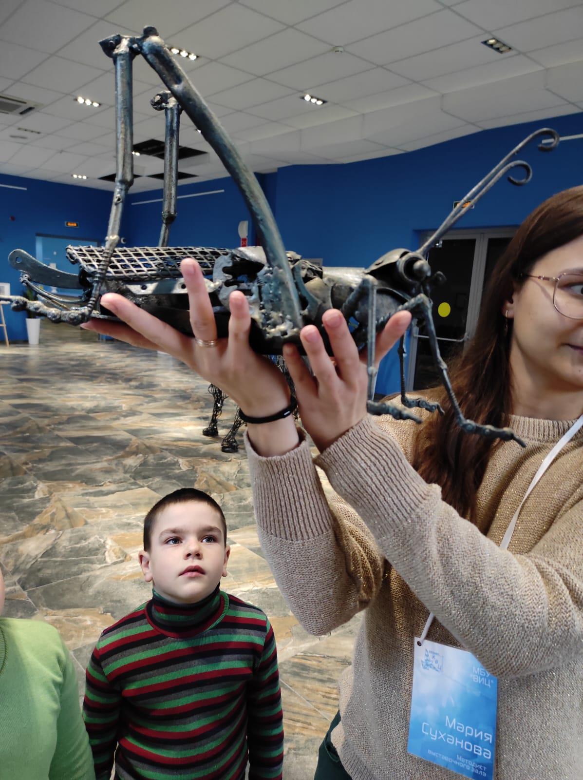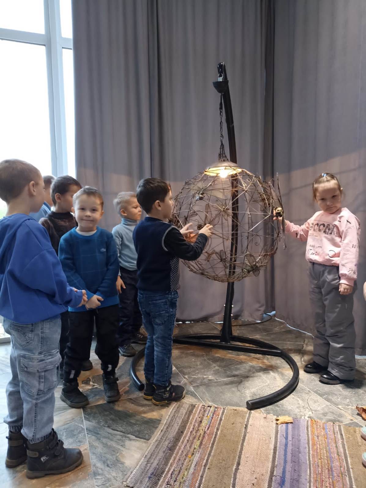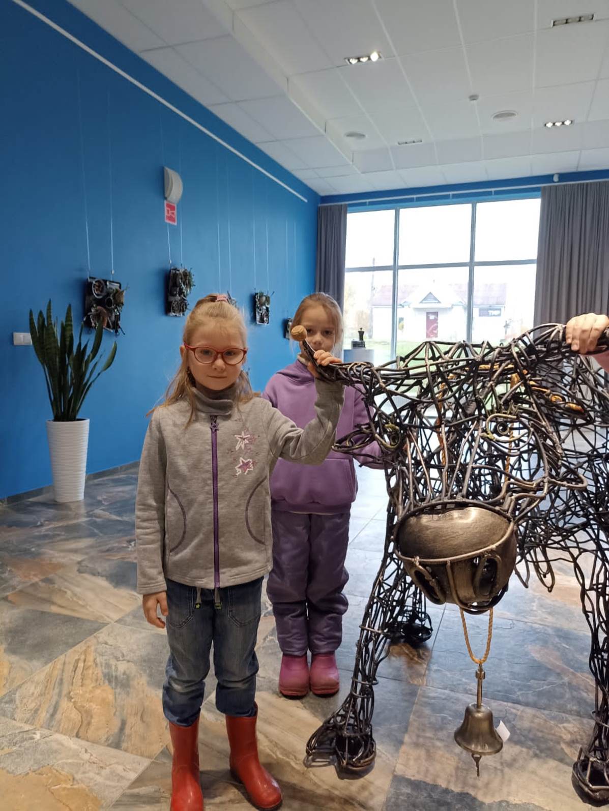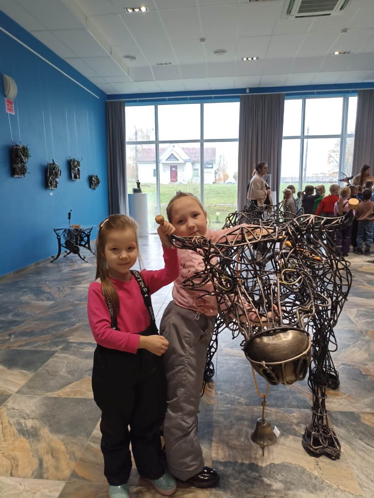 С интересом рассматривали графические работы, наблюдали за танцем стрекоз у абажура чудес, гладили добрую Буренку, экспериментировали у волшебного зеркала, удивлялись знакомым металлическим предметам в инсталляциях мастера.