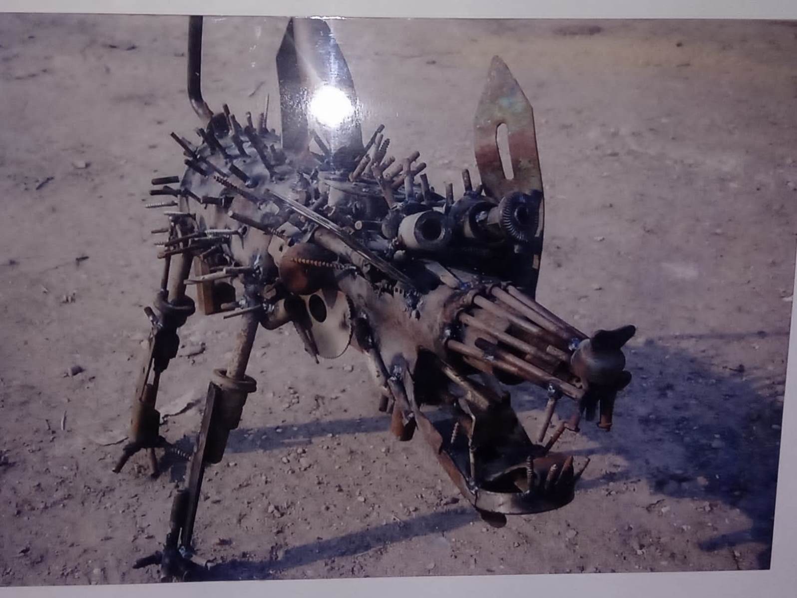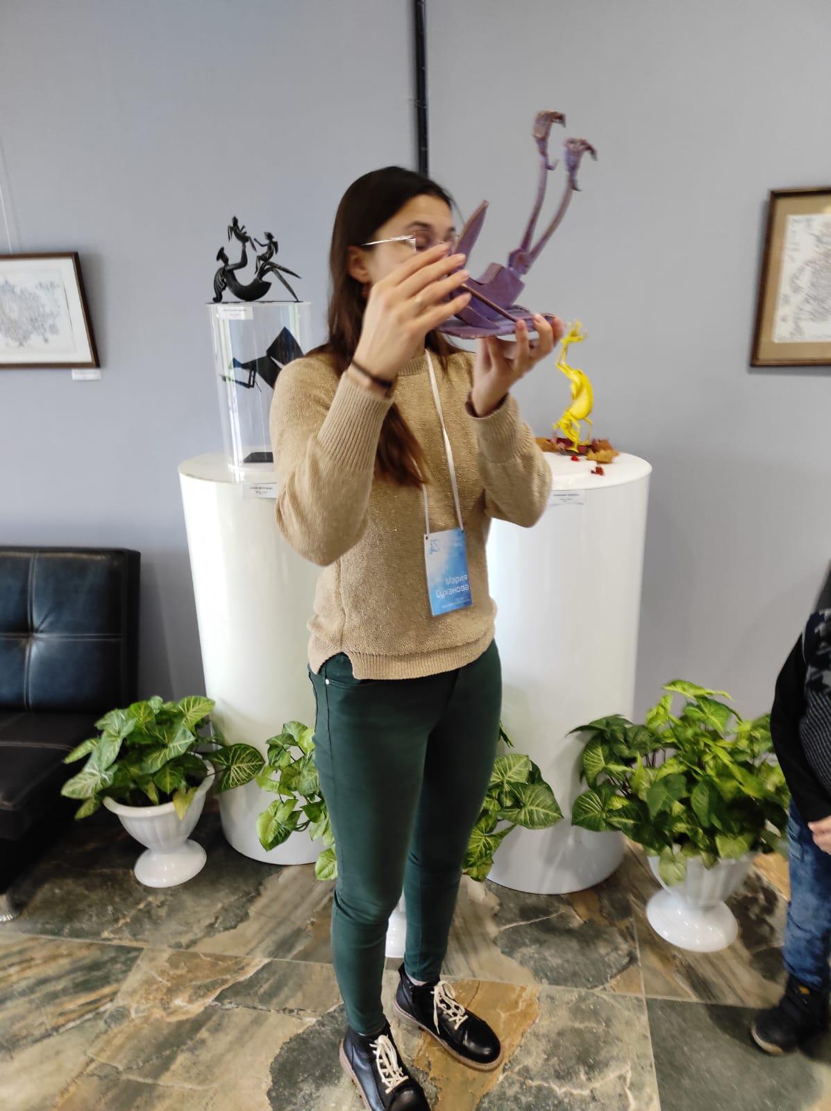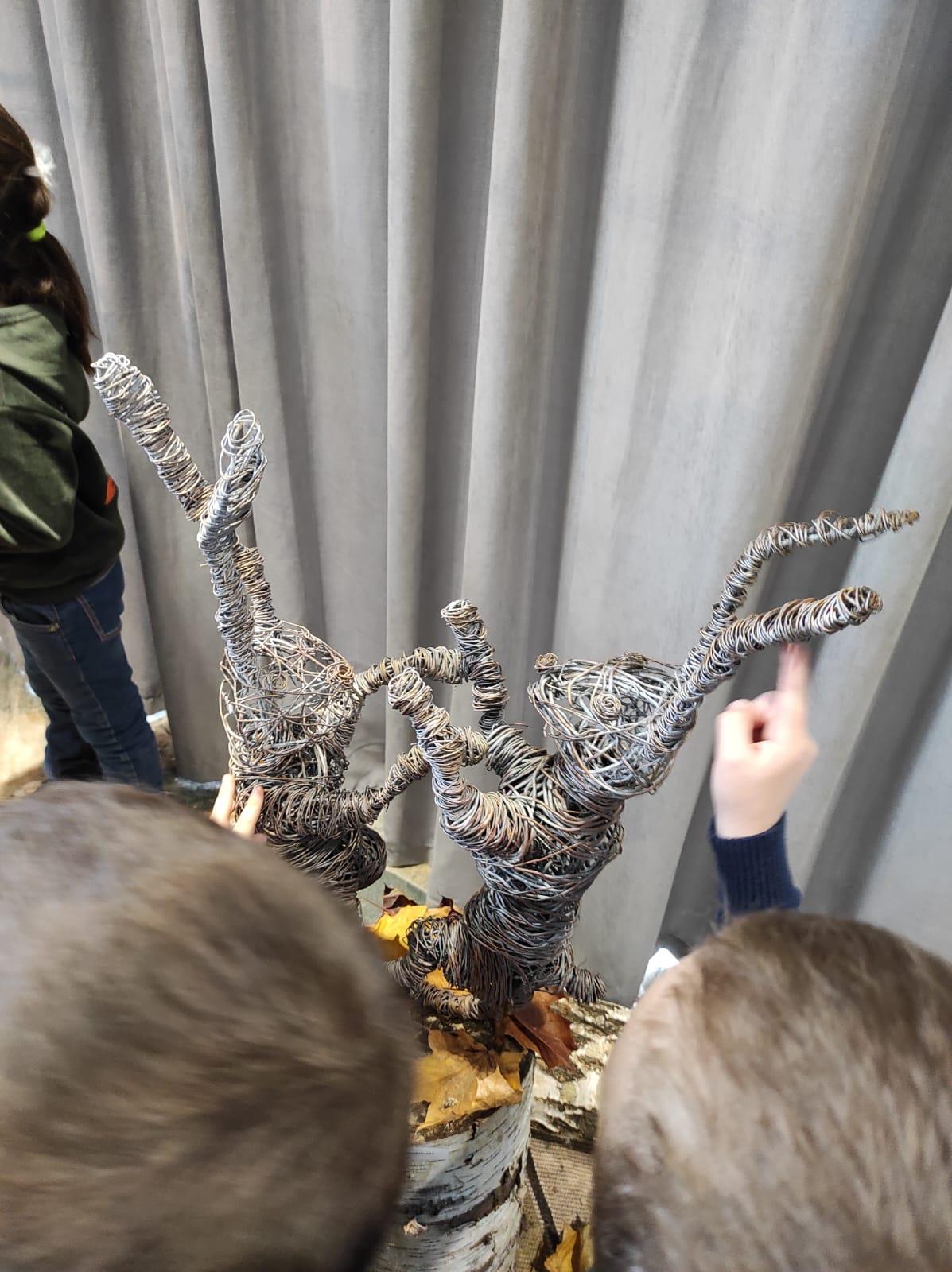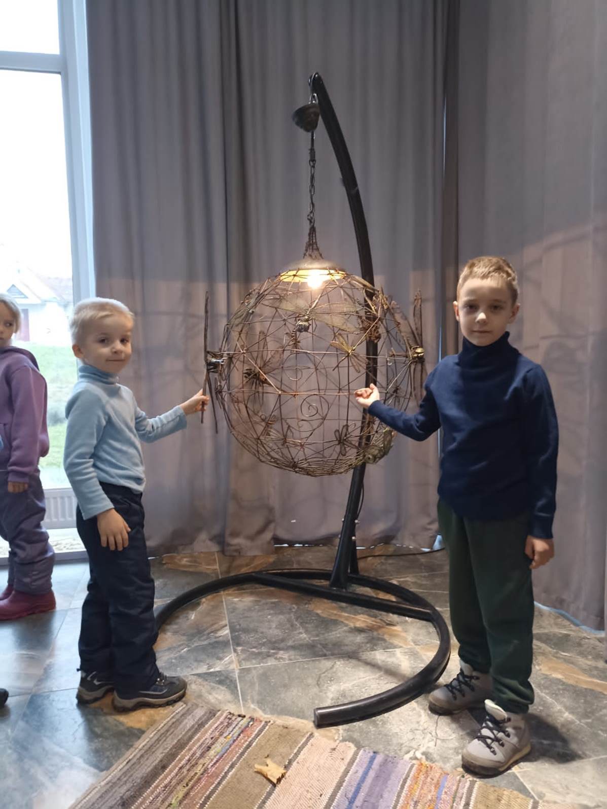 С интересом рассматривали графические работы, наблюдали за танцем стрекоз у абажура чудес, гладили добрую Буренку, экспериментировали у волшебного зеркала, удивлялись знакомым металлическим предметам в инсталляциях мастера.
