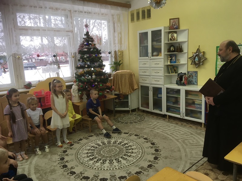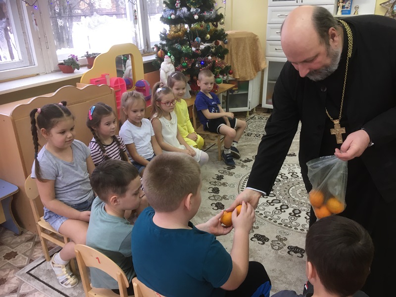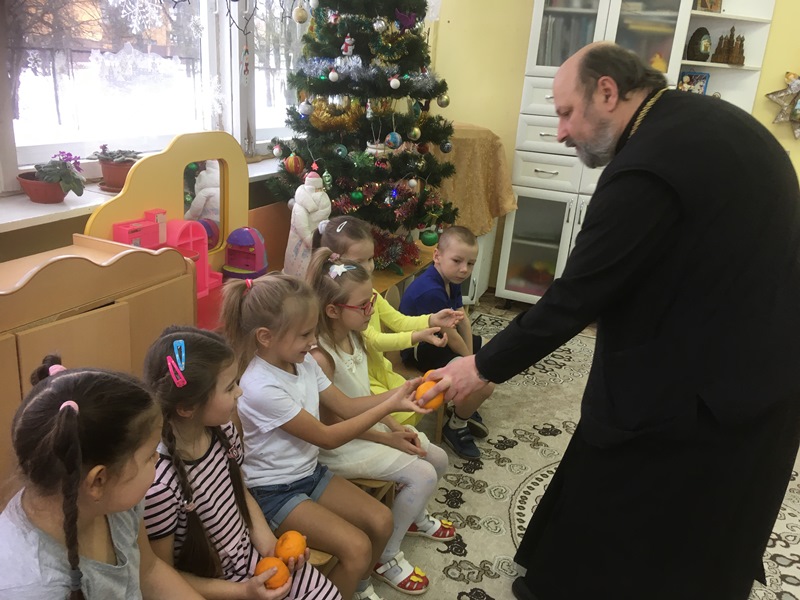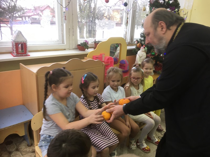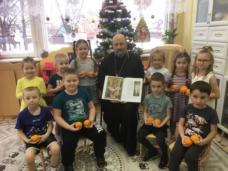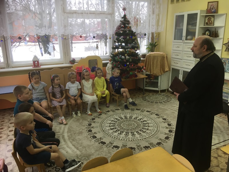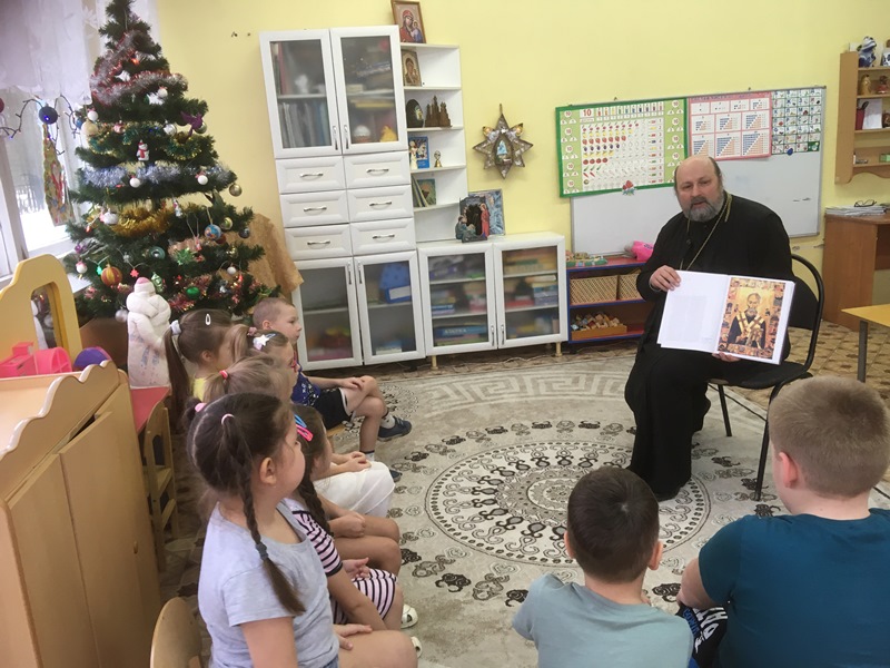 Сегодня в детском саду радостный сюрприз для детей. К ним в гости по многолетней сложившейся традиции пришел настоятель Введенского храма протоиерей Олег Переверзев. Дети подготовительной группы приветствовали батюшку, участвовали в беседе о св.Николае Чудотворце, рассматривали книгу, иконы. Поделились своими пожеланиями и просьбами в письмах к Деду Морозу, о радости от приближающегося Новогоднего праздника.