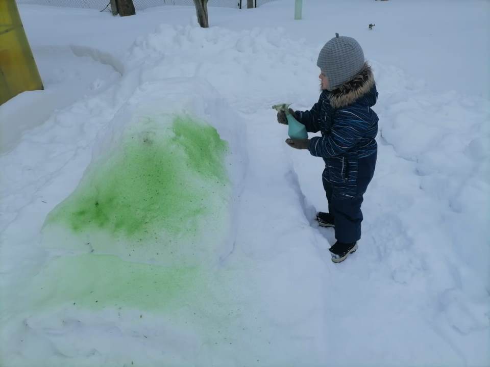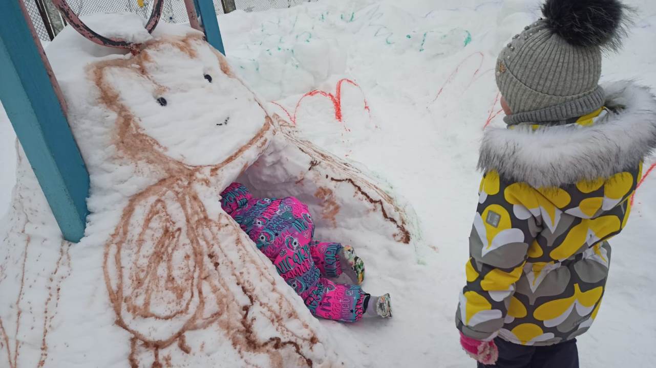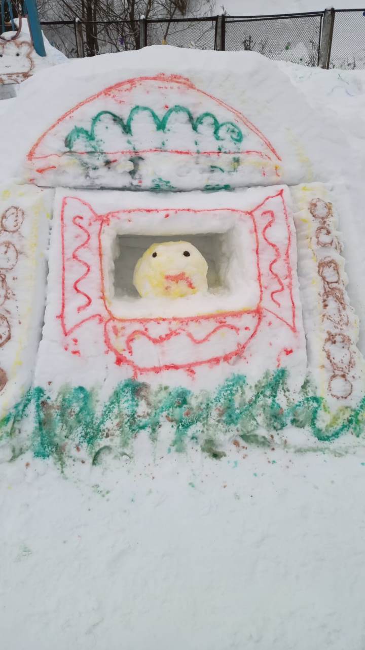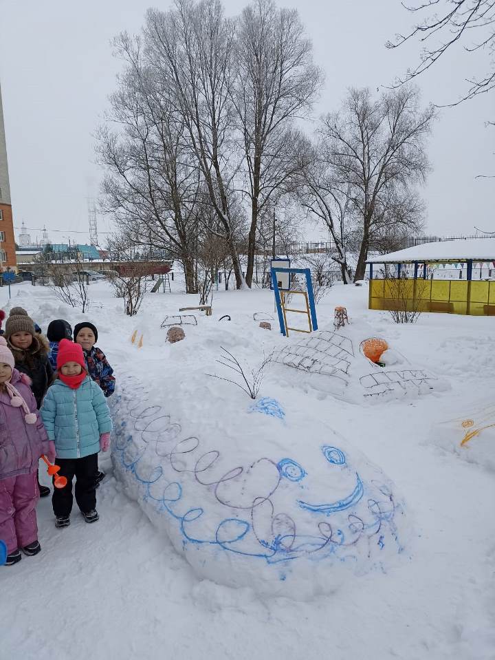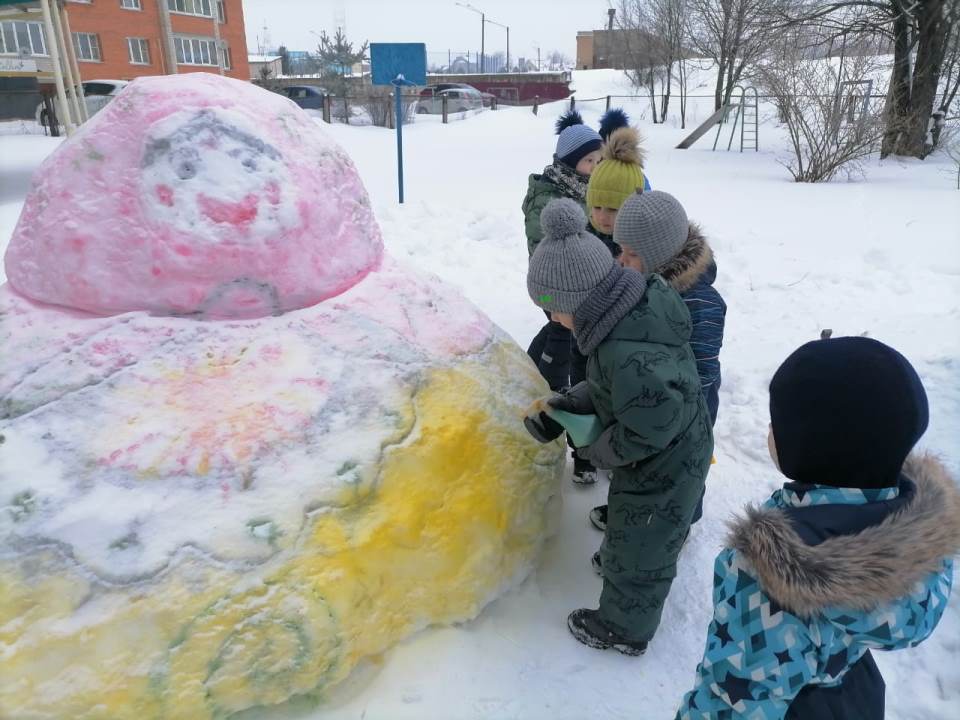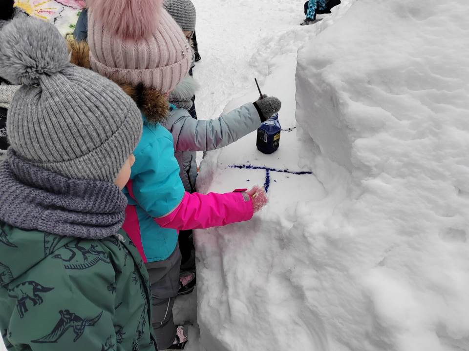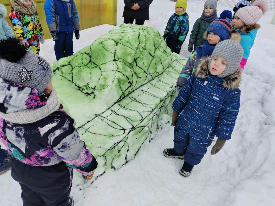 В рамках смотра построек, персонажей из снега, детям хочется поделиться своей сюжетной постройкой и посмотреть другие. Они гуляют по участкам детского сада и удивляются чудесам из снега и льда. При строительстве построек использовали технологии разрезания снега и художественное окрашивание. Все были очень результативны в работе, от разработки идеи, до ее окончательного воплощения. А как хорошо, ярко и позитивно смотрятся снежные шедевры на участках для прогулок. Дети решили, что все – волшебники!