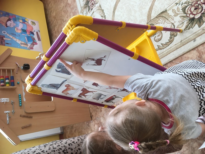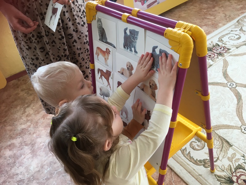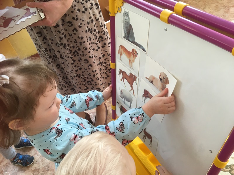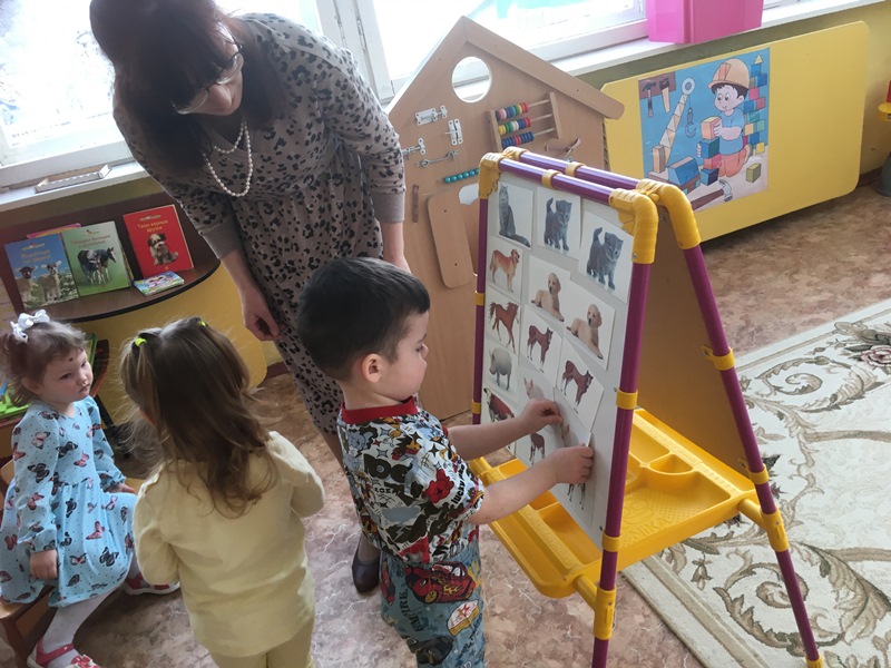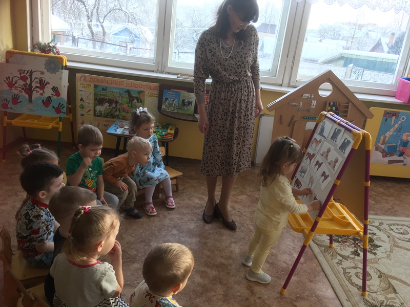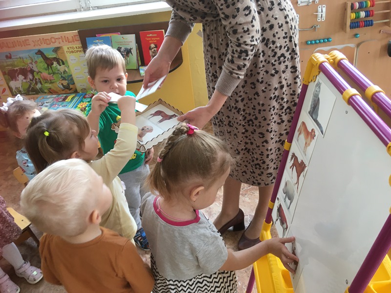 Для повышения активности детей на занятии были использованы различные игровые приемы: внезапное появление игрушек (сюрпризный момент), их обыгрывание, выполнение динамических упражнений под музыку (песенка-приветствие «Здравствуйте, ладошки», логоритмическая песенка «Котик»), создание игровой ситуации. В ходе беседы-диалога с детьми, демонстрации игрушек домашних животных и их детёнышей, дети учились называть правильно взрослых животных (собака, кошка, лошадь, свинья, корова) и их детёнышей, а также сравнивать их по величине, упражнялись в звукоподражании голосам животных и детёнышей. В игровом упражнении на магнитной доске «Найди маму» все дети проявили сообразительность и активность. На протяжении всего занятия сохранялся интерес детей, можно было наблюдать их увлеченность и положительные эмоции.