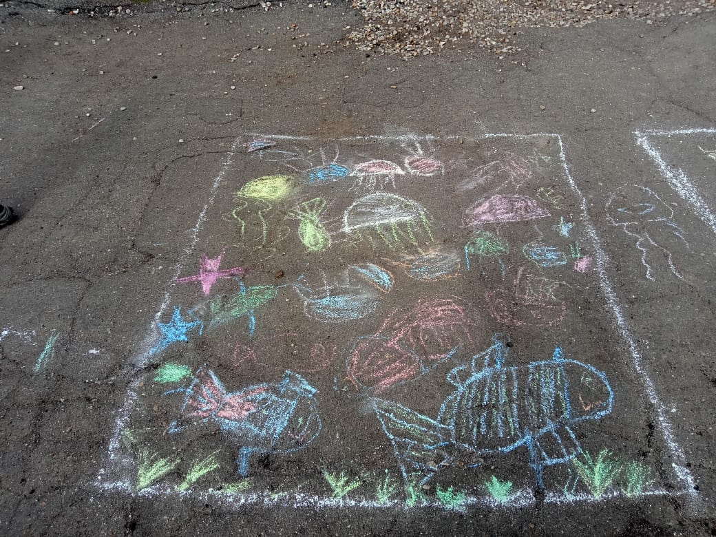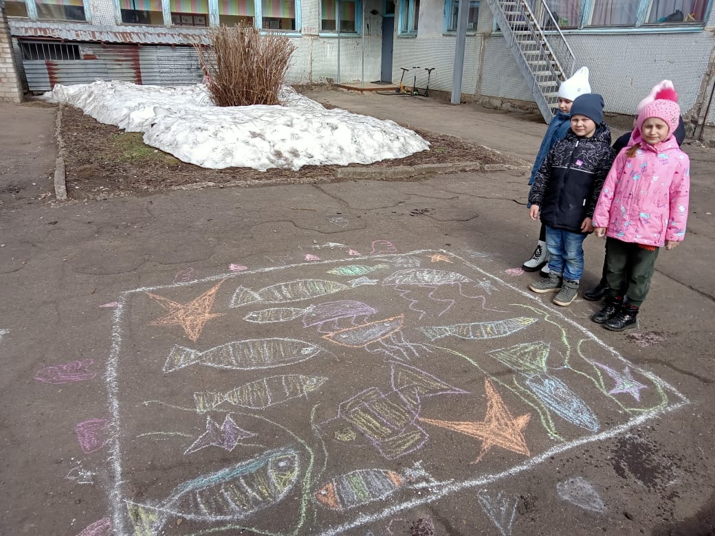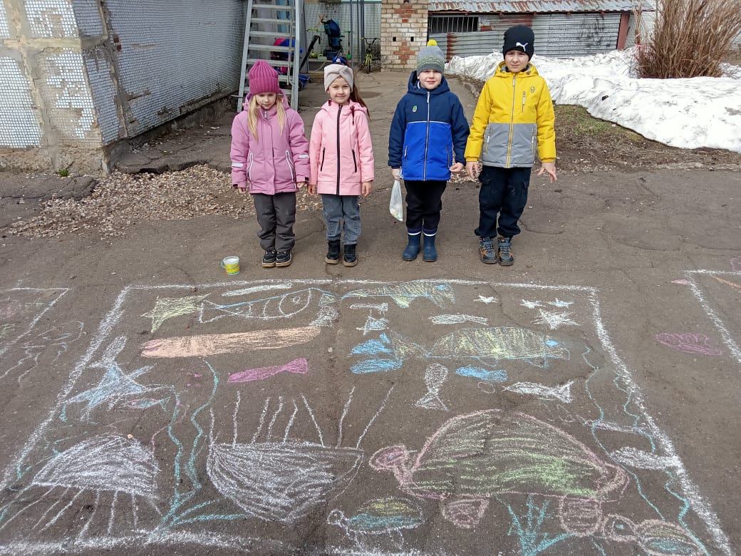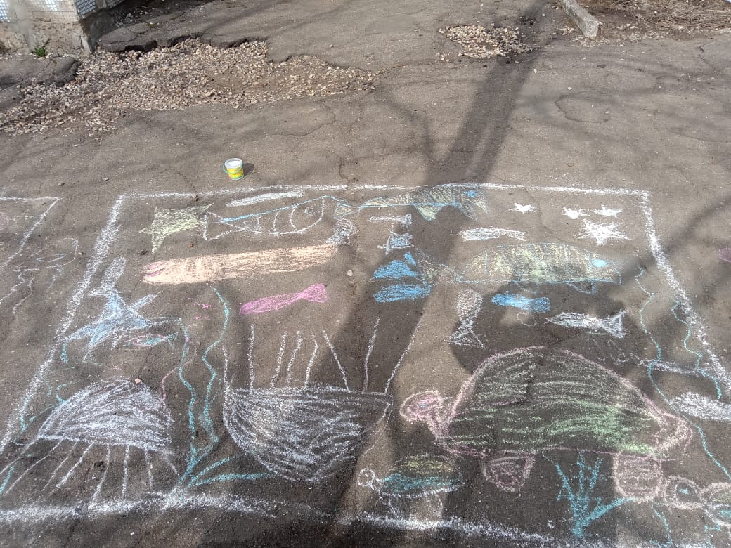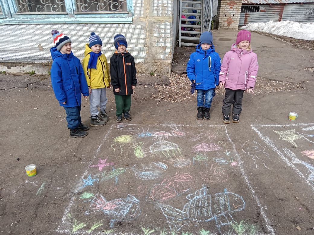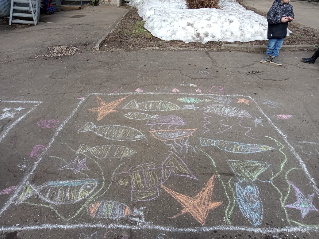 Дети изучают водный мир. Свои впечатления и знания выражают в лепке, рисовании на бумаге и мелками на асфальте.