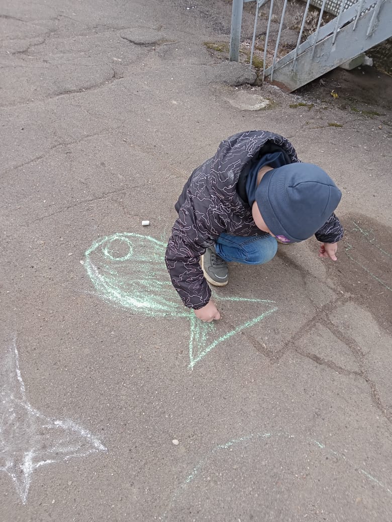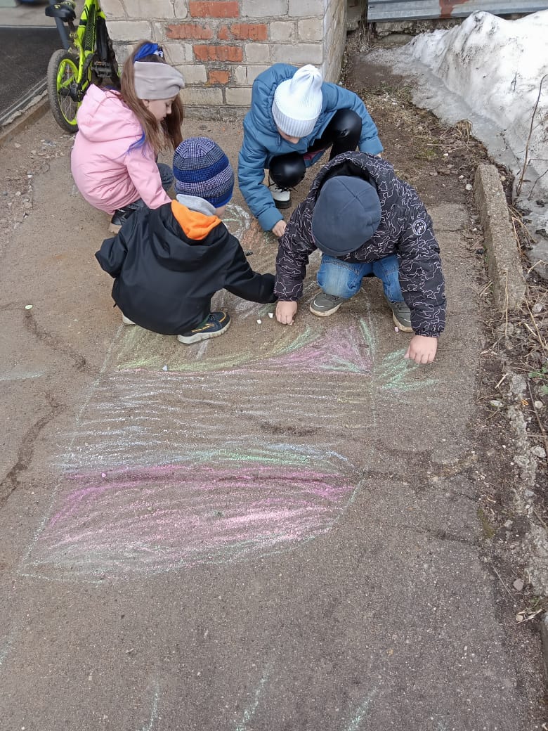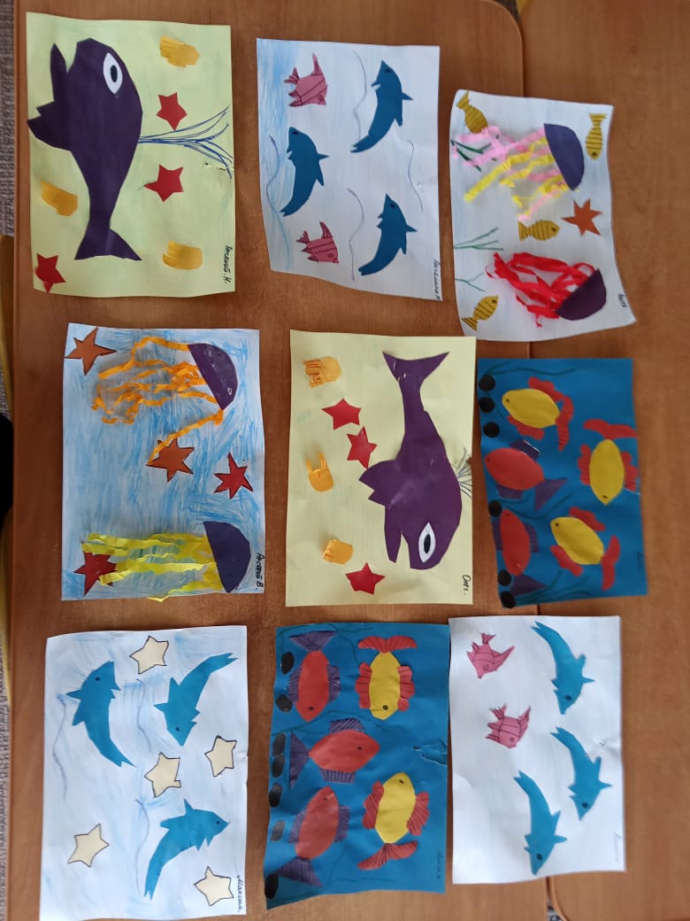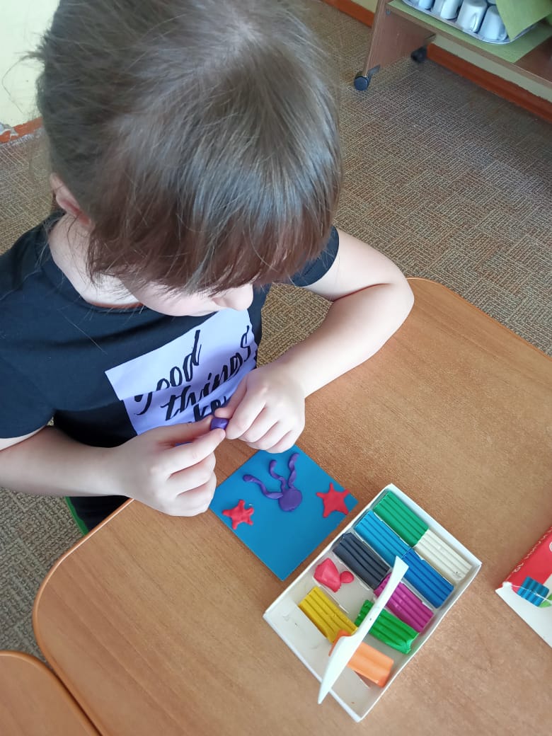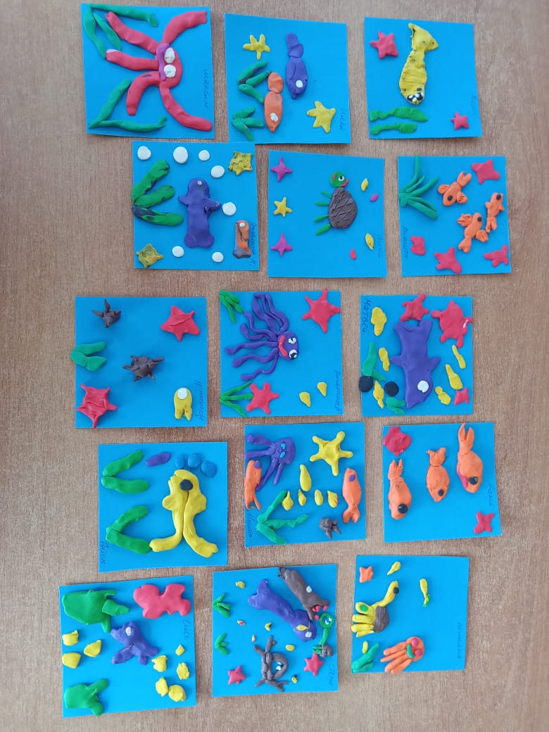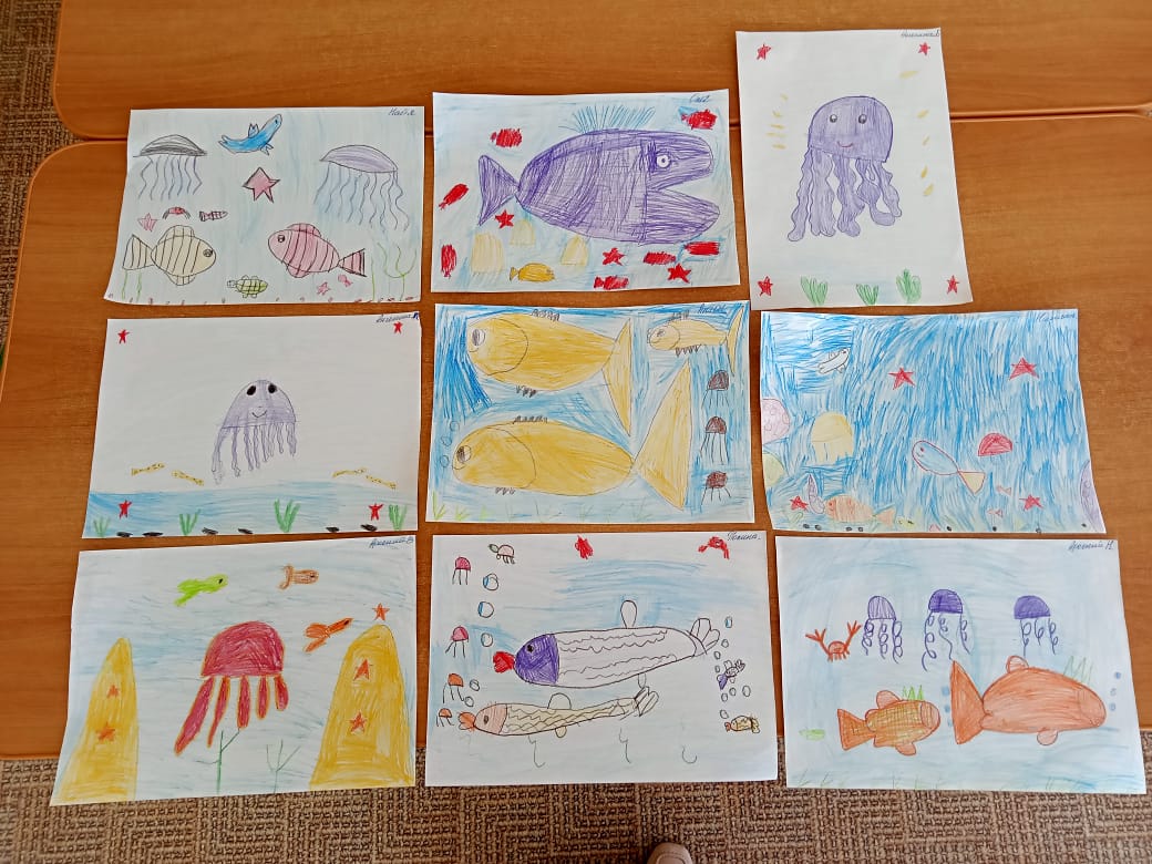 Дети изучают водный мир. Свои впечатления и знания выражают в лепке, рисовании на бумаге и мелками на асфальте.