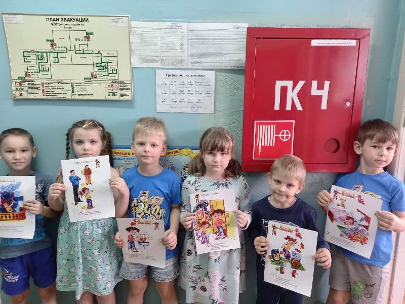 С целью закрепления знаний детей о пожароопасных ситуациях, причинах возникновения пожара, о правилах поведения при пожаре, с дошкольниками провели экскурсию по детскому саду к схемам эвакуации при пожаре, беседы по слайдам с опасными случаями, настольно-печатные игры «Можно-нельзя».