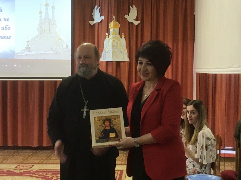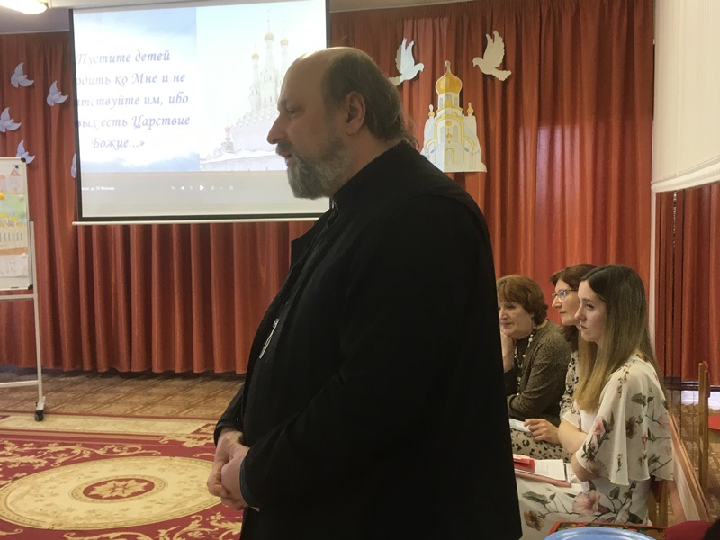 Педагоги детских садов г.Вязьмы и руководитель отдела религиозного образования и катехизации Вяземской епархии протоиерей Олег Переверзев приняли участие в просмотре интегрированного занятия по духовно-нравственному воспитанию с детьми 6-7 лет на тему «Путешествие в мир церковного искусства».