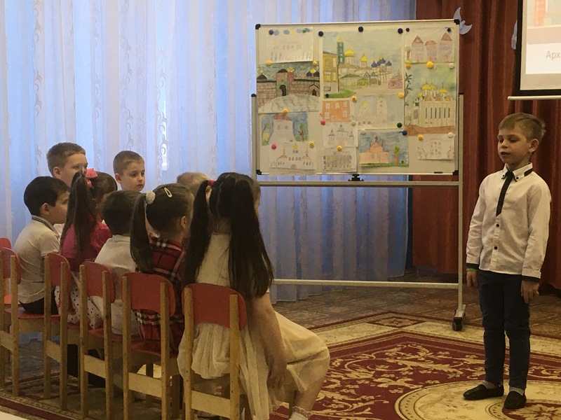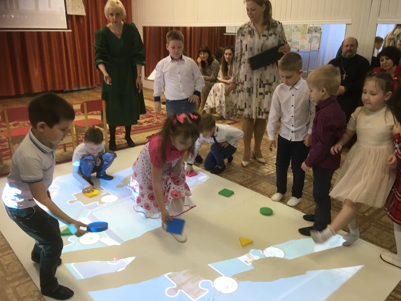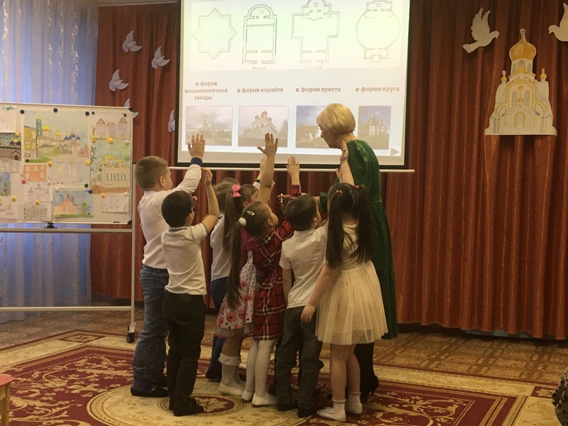 Авторы занятия – группа педагогов детского сада №10, воспитатели и музыкальный руководитель. Педагоги творчески подошли в реализации цели -обогащение внутреннего мира детей через приобщение к церковному искусству. Они познакомили детей с понятиями духовная поэзия, духовная живопись, духовная музыка, архитектура храмов. Грамотно, в доступной для детей форме, педагоги использовали интеграцию различных методических приемов: рассказ воспитателя, вовлечение детей в диалог, дидактическое упражнение «Определи жанры живописи», слушание аудио - фрагментов из духовной поэзии и музыки, чтение стихов детьми и пение, музыкальная игра «Угадай духовную музыку», виртуальная экскурсия «С чего все начиналось» на примере архитектуры зданий храмов родного города. Необычным стало превращение дошкольников в юных архитекторов в конструктивной игре «Построй храм» на интерактивном «умном полу» Magium. Результат интерактивной игры – возведение Троицкого собора.